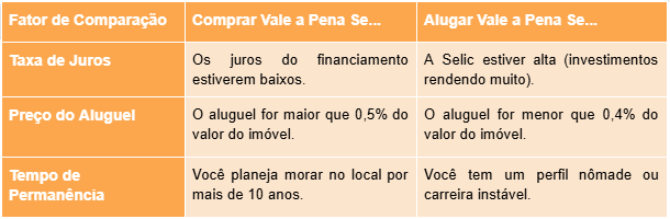 Para saber se vale a pena comprar ou alugar, existe uma regra baseada no Custo do Aluguel vs. Taxa de Juros.
